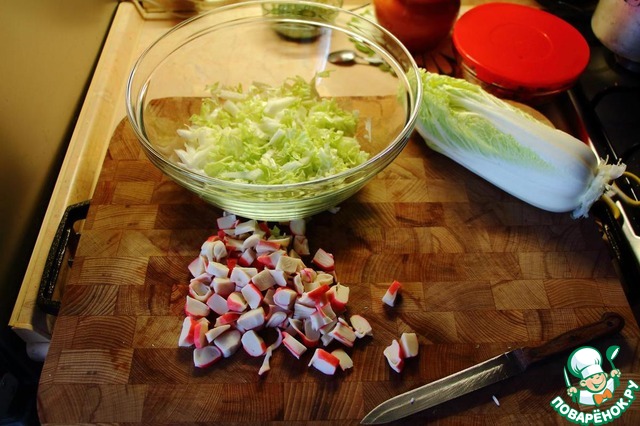 Вернемся к салату. Китайскую капусту нарежем тонкими, не очень длинными полосками, а крабовые палки просто ломтиками. Капустка здорово легкости придает...