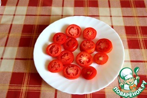 Итак удаляем плодоножку и нарезаем томаты колечками толщиной 4-5мм.