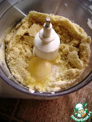 Влить желтки и воду, пробить в пульсовом режиме до собирания теста в комок.