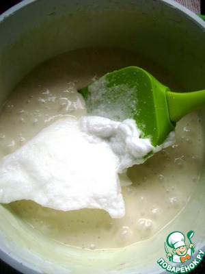 Взбить охлажденные белки (яйца обязательно вымыть перед употреблением!) до плотной пышной пены.
