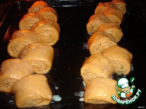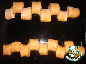 Свернуть рулетом, переложить на смазанный маслом противень и ножницами сделать равномерные (примерно 5см.) надрезы.