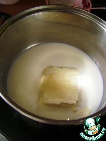 В кастрюлю влить молоко, воду, положить масло, соль и сахар.