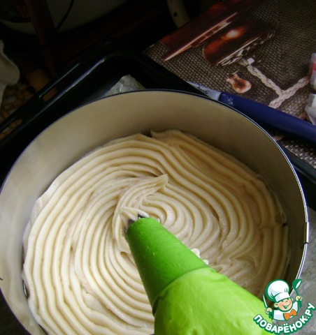Быстро переложить в кондитерский мешок с зубчатой насадкой большого диаметра и по спирали отжать его в форму диаметром 22 см.