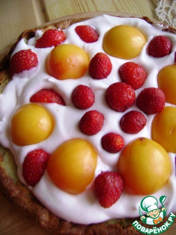 Торт разрезать пополам, выложить половину сливочного крема на нижнюю часть, разложить абрикосы и клубнику.