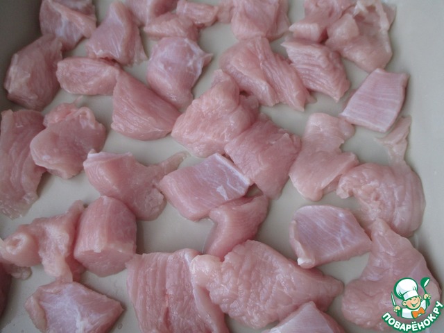Филе грудки индейки порезать небольшими кусочками и выложить на слегка смазанный растительным маслом противень.