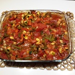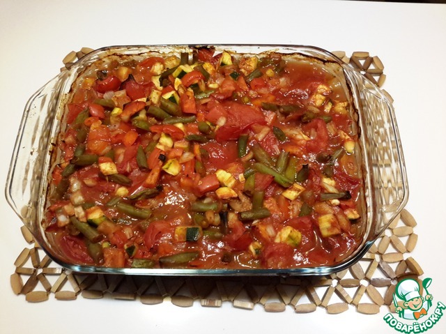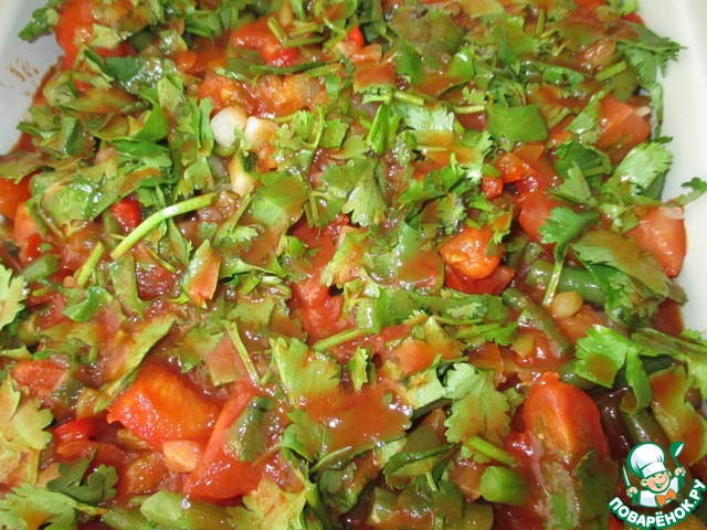 Смешать томатную пасту+воду+сахар+соль до растворения кристаллов =залить овощи, посыпать рубленной кинзой, перемешать и поставить в прогретую до 180 градусов духовку на час.