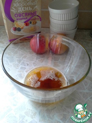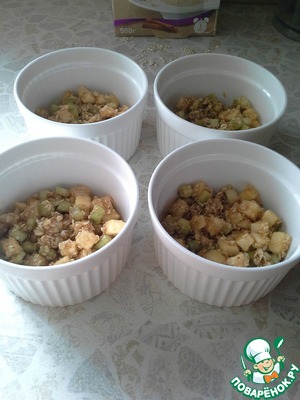 Разложить яблочно - ревеневую начинку в четыре порционные формы для выпечки.