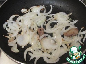Пока печень готовится, в сковороду влить подсолнечное масло, выложить лук и кусочек печени, поджарить до золотистого состояния лука.