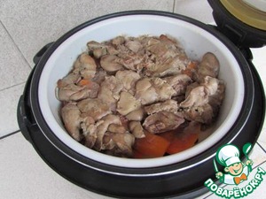 В чашу для варки на пару сложить слоями морковь и куриную печень. Выбрать программу "Варка на пару" или как у меня "Суп", время выставить 20 мин.