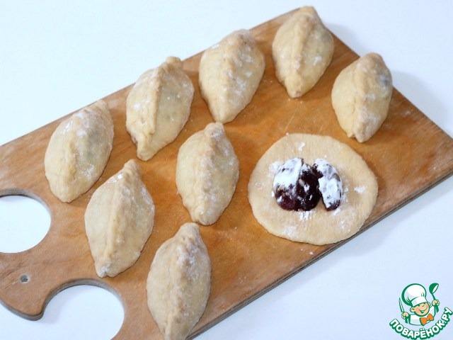 Положить начинку: 1 ч. л. джема и 3-4 дольки сливы, сформировать пирожок.
