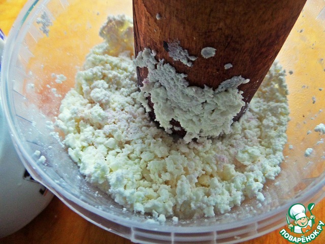Творог протереть через сито или хотя бы растолочь крупные комочки толкушкой.