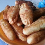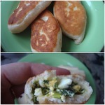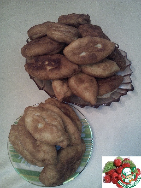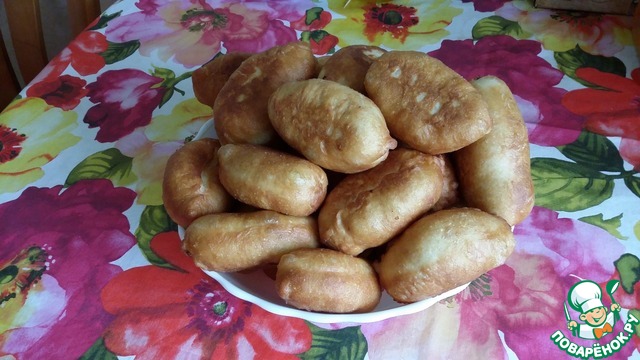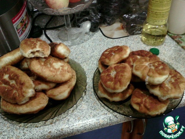 Когда лепила этот пирожок вспомнила, что моя бабушка делала пирожки с картошкой большими, тонкими и плоскими, этакими лаптями, поэтому этот пирожок после стадии начинения я активно придавила ладонью к столу! После жарки про него и не скажешь, что изначально он был тонким) Или казался?