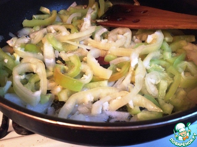 Куриное филе нарезать кубиками, поперчить, посолить, добавить специи и перемешать. В сковороде разогреть растительное масло и обжарить филе до изменения цвета. Добавить репчатый лук и болгарский перец. Готовить вместе 7 минут помешивая.