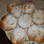 Но, когда поставила их в духовку при температуре 210 градусов (по моей плите) . и взглянула через стекло на них через минут 10, то просто прилипла к табуретке: булочки увеличились в высоту и в ширину почти в два раза. Они стали пышными, просто кустодиевскими красавицами: румяными, аппетитными. И заняли весь противень, даже не скажешь, что до выпечки они сиротливо и в далике друг от друга на нем находились. Я дала им остыть на решетке. Потом посыпала сахарной пудрой. Общий вес булочек составил 570 г.