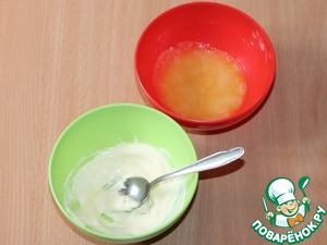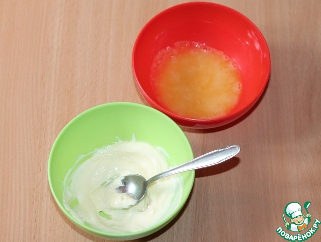 3. Растереть в разной посуде, масло и желтки с сахарной пудрой добела. Сахарную пудру в каждую чашу по 1 ч. ложке.