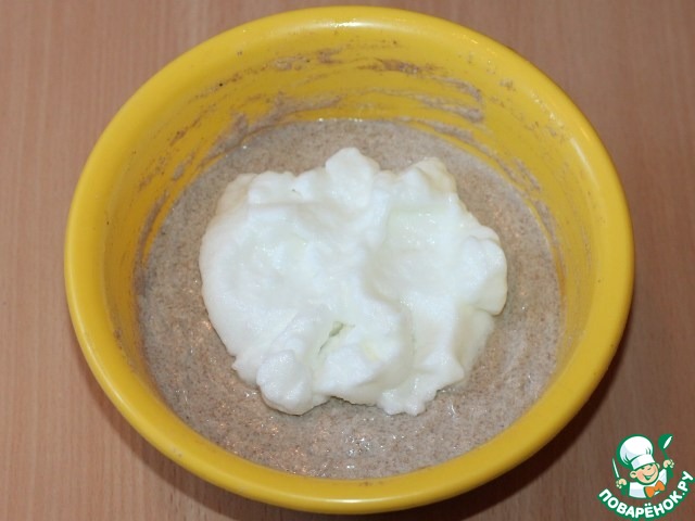 Влейте в тесто молоко (1,5-2 стакана), перемешайте, затем введите взбитый белок и аккуратно перемешайте до однородности. -