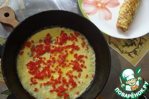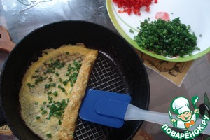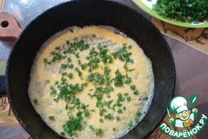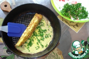 Прогреваем сковороду и обязательно смазываем ее маслом. Выливаем небольшое количество омлетной массы и тут же посыпаем ее зеленью. Оговорюсь сразу, толщина блинчика - сугубо по вашему желанию. Я люблю тоненькие блины, они быстрее прожариваются и у них большая слоистость. Но вы ориентируйтесь на свой вкус.