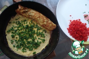 Вылейте вторую порцию. Слегка приподнимите уже готовый блинчик, что бы тесто затекло туда и при сворачивании там не было зазора. Посыпьте зеленью.