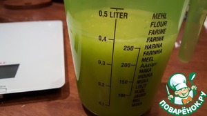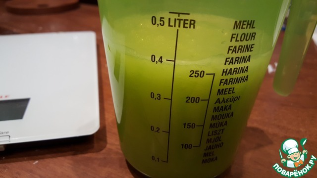 Кабачок натереть на тёрке для пюре. Получится кабачковое пюре, практически сок с мякотью. Нам понадобится 400 мл такого пюре.