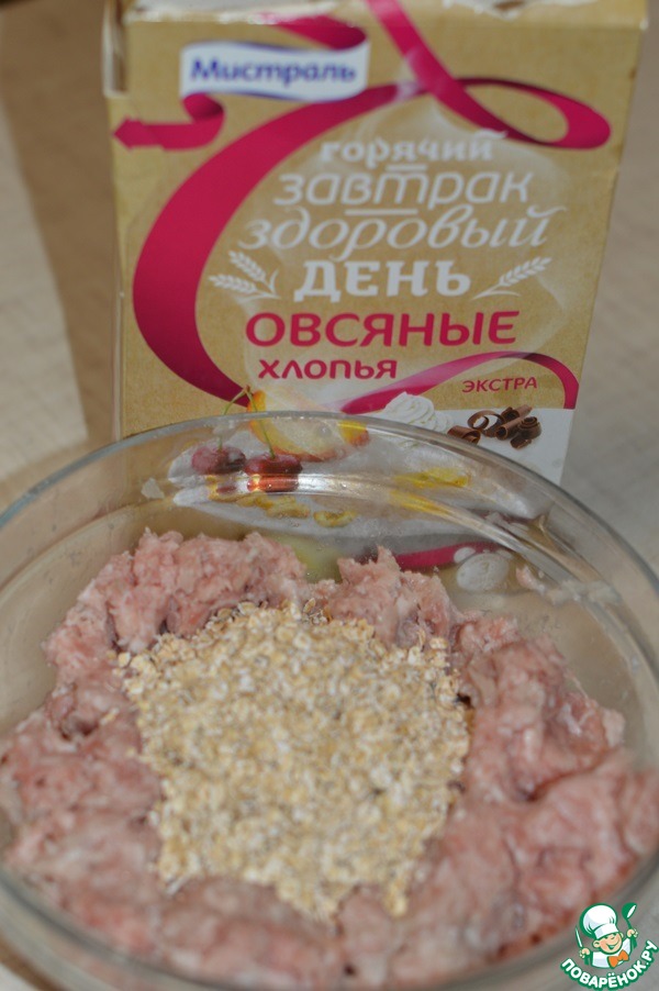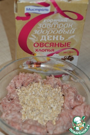 Затем слить сок. В фарш добавить хлопья. -