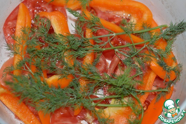 Помидоры нарезать толстыми кружками, перец соломкой.