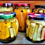 В каждую баночку с кабачками положить по 5 штучек чёрного перца-горошка, по 1/2 чайной ложке семян горчицы, по два зубчика чеснока, порезанного пластинками, влить по 1 чайной ложке уксусной эссенции. -