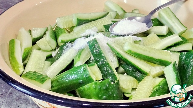 Сложить огурцы в эмалированную чашку, посолить и хорошо перемешать. Оставить минимум на 30-40 минут, периодически перемешивая.