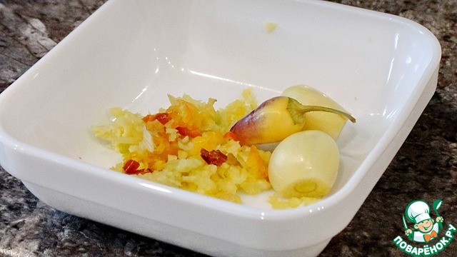 Чеснок очистить и вымыть. Горький перец вымыть и вместе с чесноком раздавить с помощью чеснокодавилки.