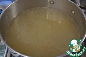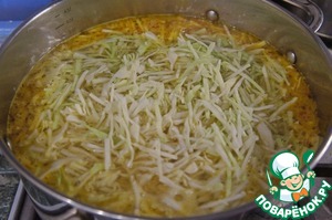 Бульон довести до кипения, опустить в него зажарку и картофель. Снова довести до кипения и варить на маленьком огне 5 минут. Добавить капусту