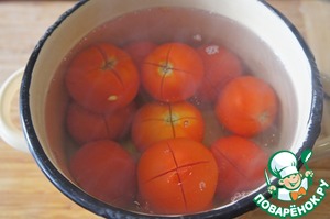 Помидоры надрезать крест-накрест, залить кипятком на 3 минуты, слить, обдать холодной водой, снять кожицу и мелко нарезать.