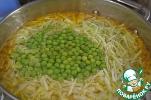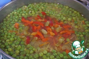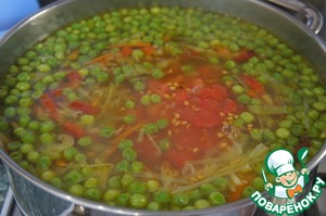 И зеленый горошек, варить после закипания 5 минут. Посолить по вкусу.