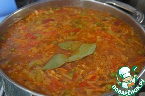 Томат-пасту и лавровый лист, варить на маленьком огне до готовности.