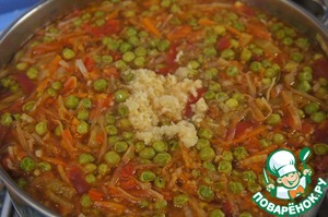 Снять с огня и добавить измельченный чеснок. Дать супу настояться под крышкой 10 минут.
