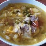 Сварить мясной бульон, процедить. Мясо разобрать на кусочки и вернуть в кастрюлю. Подготовить овощи, вымыть их, очистить и нарезать. Морковь и сельдерей нарезать соломкой, лук измельчить. Картофель нарезать небольшими кусочками. Капусту тонко нашинковать. Перец нарезать лапшой.