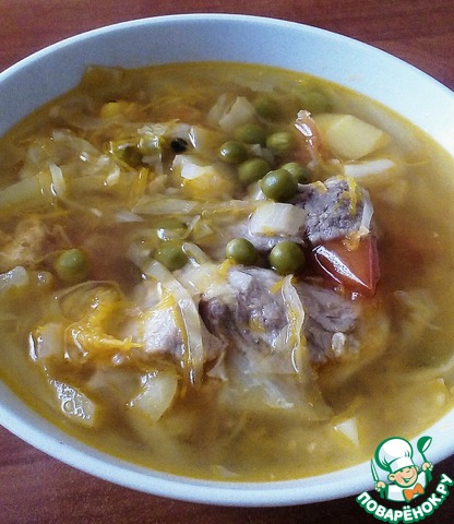 В этом году у меня на даче огромный урожай гороха. Ничего удивительного, лето-то нынче отменное. Горох я заморозила, но муж попросил сварить суп с молодым зеленым горошком. А мне горохового супа не хотелось, а хотелось супа овощного. И вот такой супчик у меня родился.