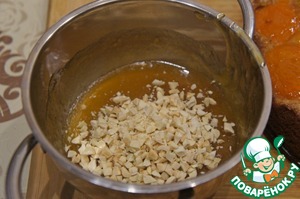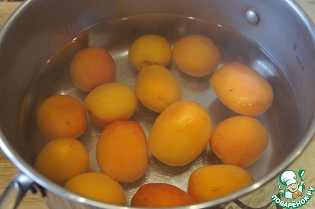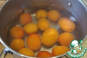 Абрикосы залить на несколько минут кипятком, затем обдать холодной водой и снять кожицу, вынуть косточки.