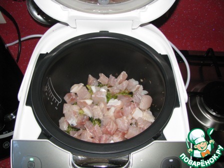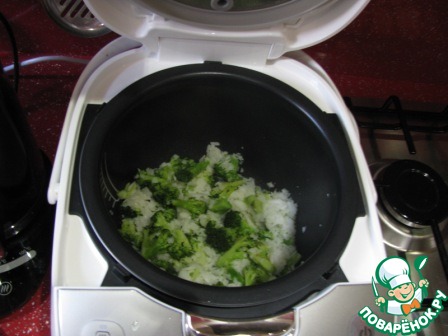 Обжариваем брокколи с луком, в режиме "Жарка" 10 минут.