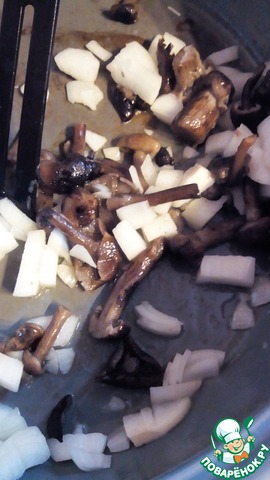 Лук режем кубиками, обжариваем на растительном масле, добавляем грибы и обжариваем минут 5-7.