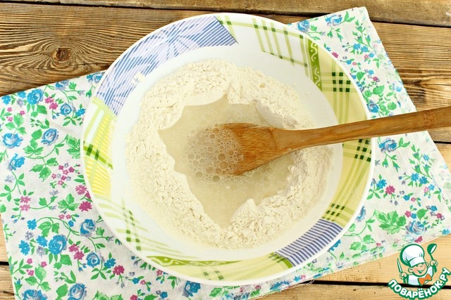 Муку просеем, сделаем углубление, выльем в него воду с солью и маслом.