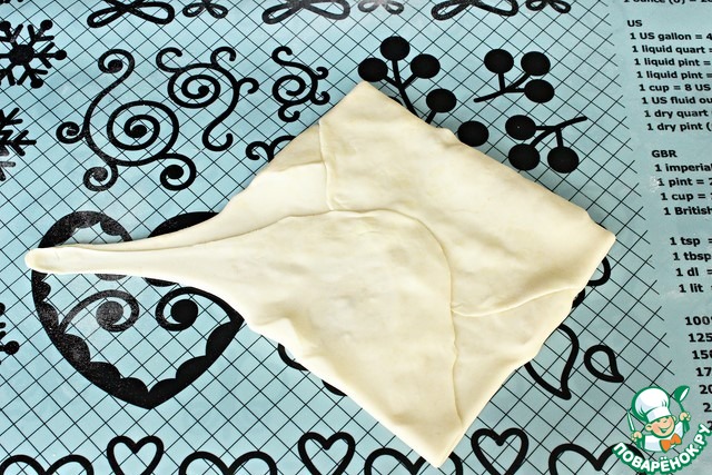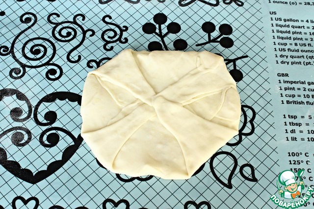 Из каждой части раскатаем лепешку, как можно тоньше. Выложим начинку (50-70 г) в центр лепешки, посолим.