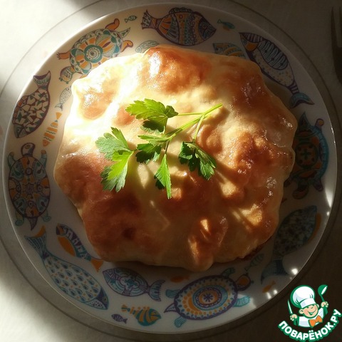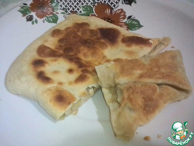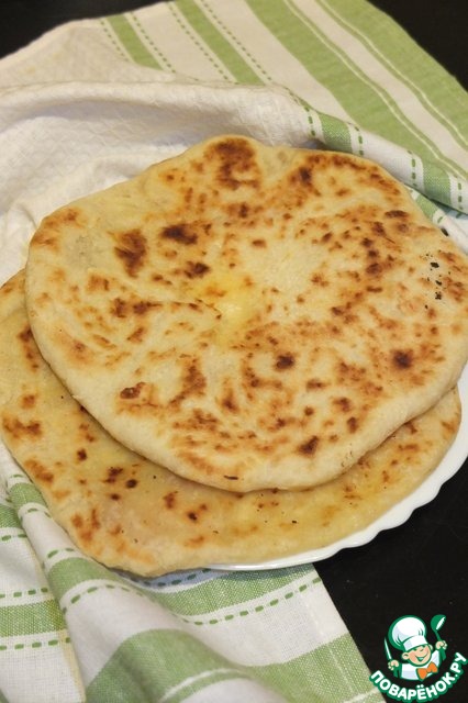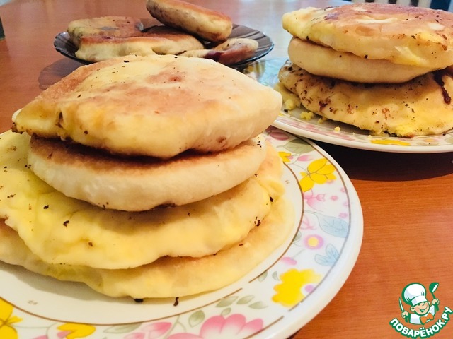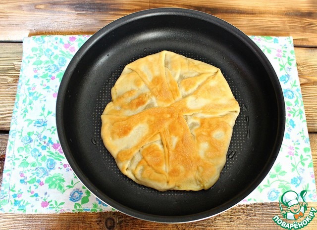 Сковороду с растительным маслом хорошенько разогреем, выкладываем лепешку швом вниз, огонь убавляем до минимального. Накрываем сковороду крышкой и жарим 5-7 минут с каждой стороны.