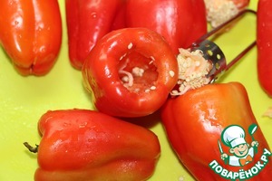 Перцы разрезать вдоль пополам, удалить семена и белые мягкие перегородки.