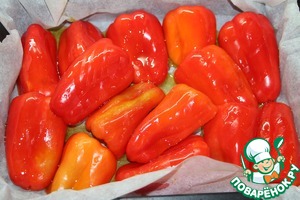 Сбрызнуть противень, застеленный бумагой для выпечки, оливковым маслом. Выложить на него перцы и запекать в разогретой до 160 °С духовке (лучше всего в режиме «конвекция + гриль») примерно 40 мин.
