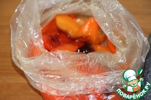 Очищенные перцы нарезать тонкими полосками. Чеснок раздавить, мелко порезать или пропустить через пресс для чеснока.