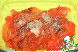 Выложить перцы в плоскую посуду, приправить чесноком, солью и перцем, добавить сухой базилик. -
