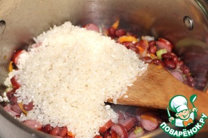 Промыть рис и всыпать его в кастрюлю, еще 3 минуты готовить помешивая.