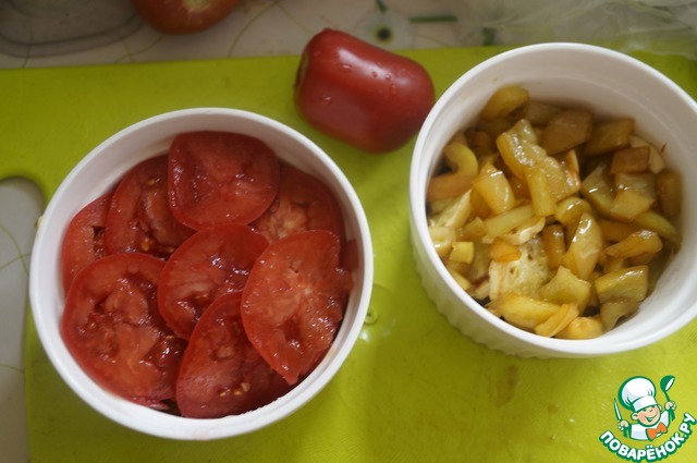 Баклажан и кабачок нарезать тонкими кружочками, болгарский перец - кубиками. -