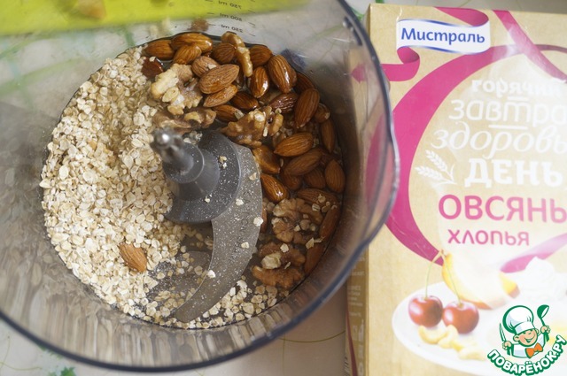 В чашу блендера выложить орехи, овсяные хлопья, влить масло и посолить по вкусу.
