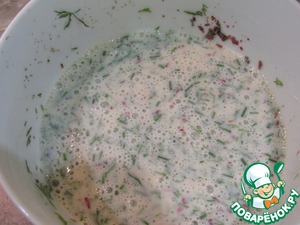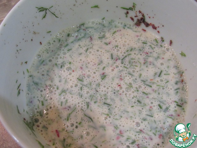 Взбиваем сливки с 1 яйцом, добавляем соль, перец, паприку и рубленную зелень укропа. -