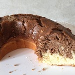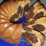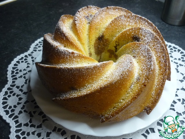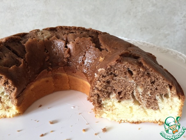 Яйца смешать миксером с сахаром. Добавить масло, молоко, просеять муку, смешанную с разрыхлителем и ванильным сахаром. Половину массы вылить в форму, а во вторую половину засыпать какао и шоколадную каплю. Перемешать и залить также в форму.